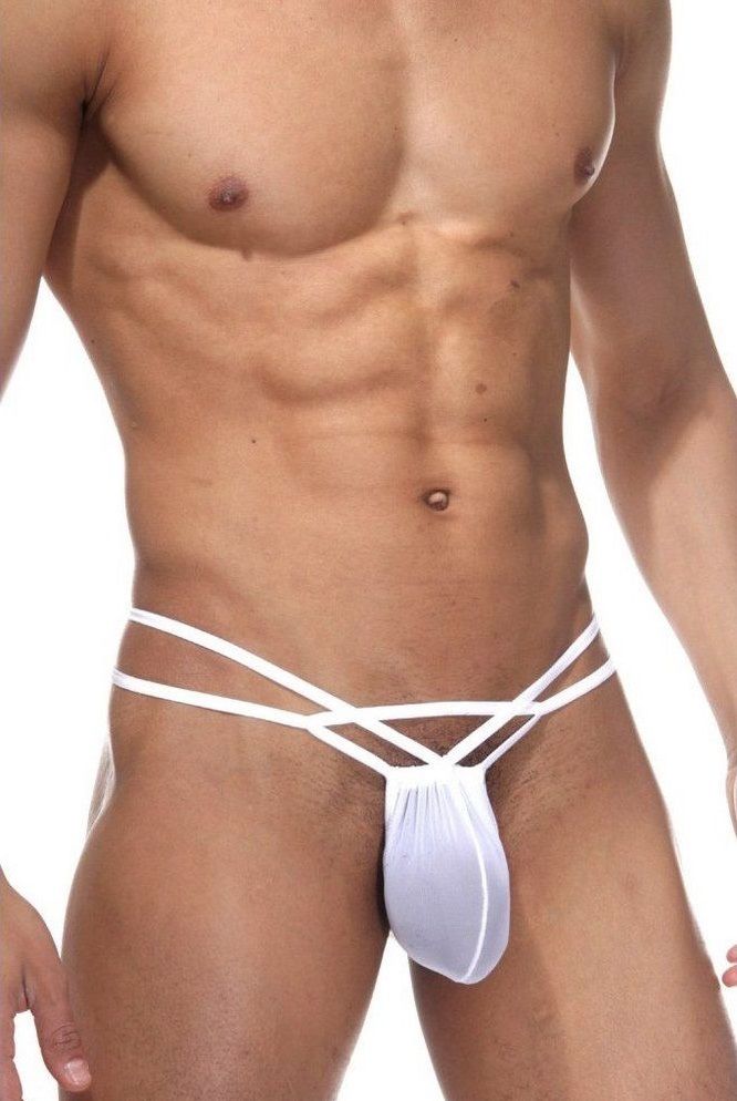 Белые мужские трусы-джоки. Верхняя бретель может быть завязана вокруг талии или бантиком прямо на гульфике-мешочке.