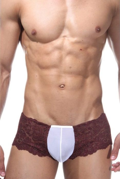 Кружевные коричневые трусы-хипсы с низкой посадкой для мужчин. Спереди белая эластичная плотная вставка.