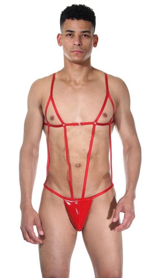 Мужское боди красного цвета из плотной гладкой ткани. Трусы-стринги, по телу спереди и сзади комплект ремешков.