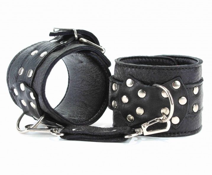 Кожаные наручники черного цвета. Украшены заклепками и соединяются между собой цепью с карабинами/ Размер наручников регулируется при помощи застежки Ширина - 6 см. Длина цепочки - 15,5 см.