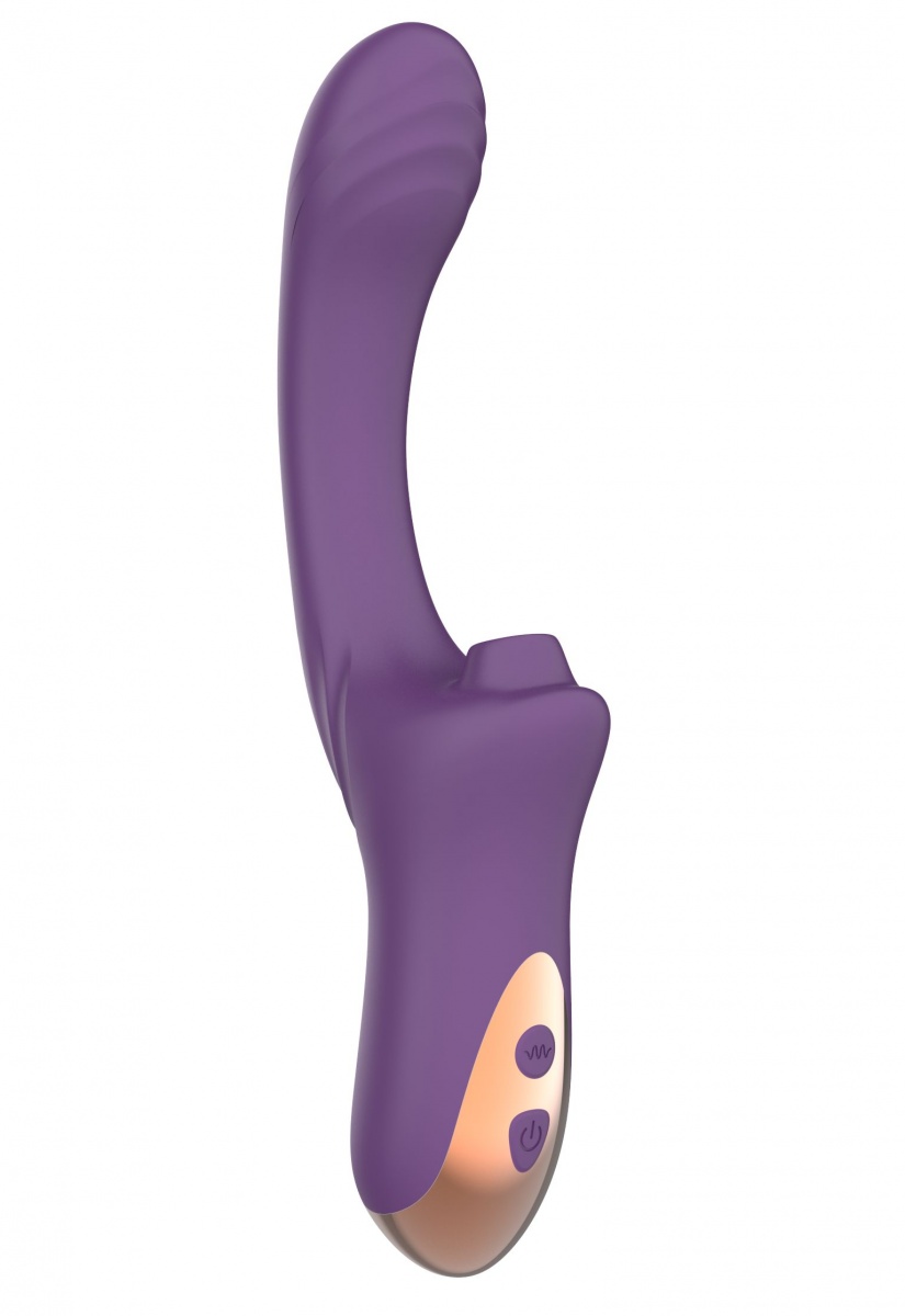 Фиолетовый вагинально-клиторальный вибратор. 10 режимов вибрации и 10 режимов посасывания в клиторальном отростке. Рабочая длина - 15,5 см.